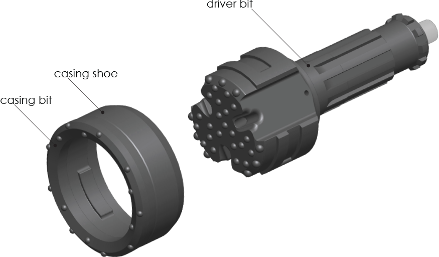 - A Casing Bit that is locked onto the driver bit drills the void for the casing to advance down the hole.
