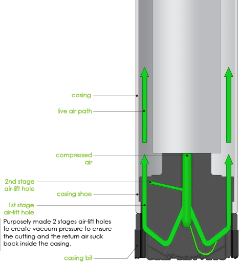 - i. Compressed air travels back between the casing and inner drill string. There are two stages of air-lift hole creating vacuum pressure to ensure all cuttings and return air to suck back inside the casing. The second stage of Air-Lift Holes is to make sure and increase the suction effect efficiency and accelerate the cuttings inside the casing.